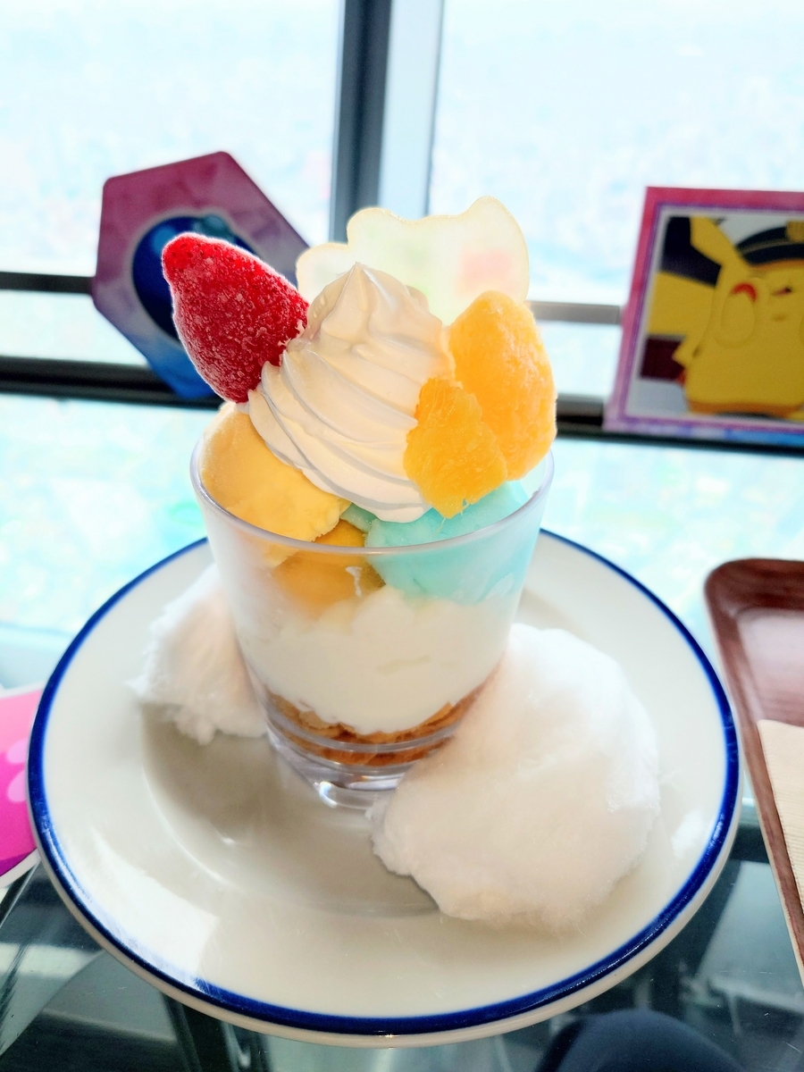 カップの中は最下層のフレークの上に杏仁豆腐、その上にはクワッスイメージのラムネアイス、ニャローテイメージのメロン、ホゲータイメージのイチゴ、リザードンイメージのオレンジ、キャプテンピカチュウをイメージしたマンゴーなどが乗っていました。